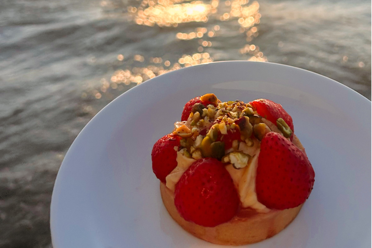 Strawberry and cream pate tart topped with pistachio